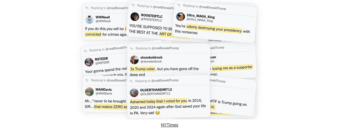 But it’s not just well-known voices that have become negative. A NYTimes analysis of Truth Social posts by Mr. Trump’s true believers have found many who are now disillusioned.