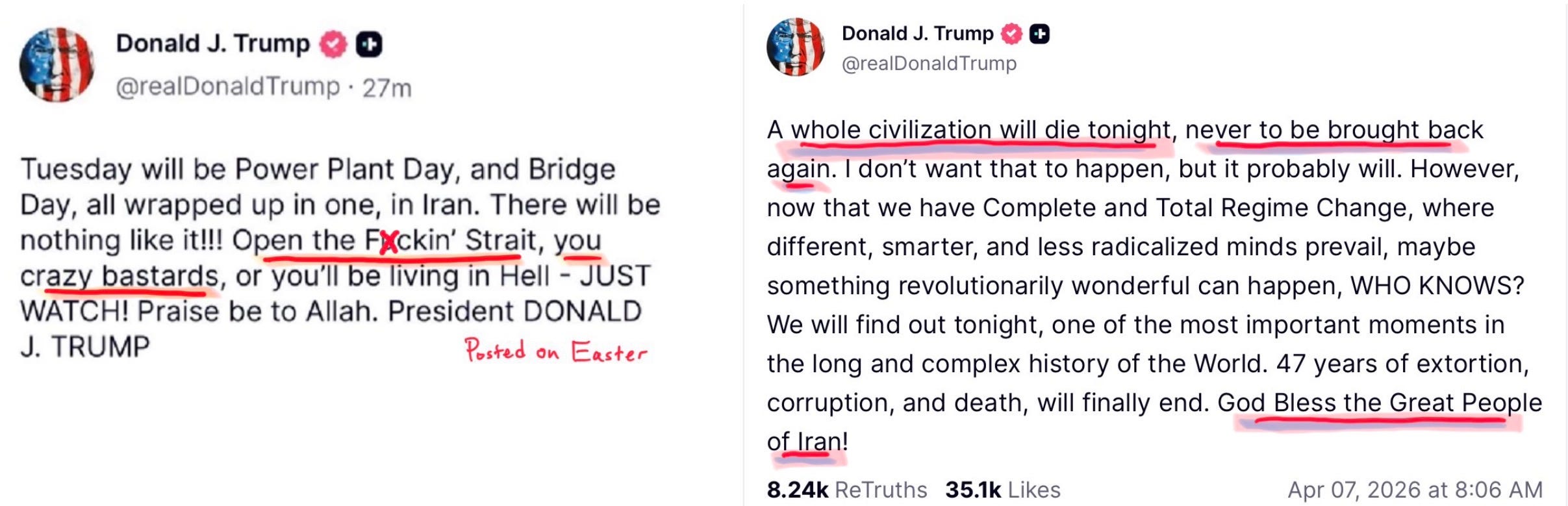 Tucker Carlson delivered a 43-minute monologue Monday [April 6] framing Trump’s Iran rhetoric as morally corrupt and even “evil.” He expressed personal outrage at Trump’s Easter post threatening to bring “hell” to Iran, and urged U.S. officials to defy any orders that could kill civilians.