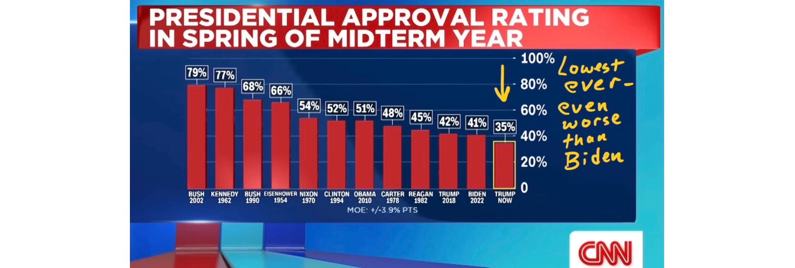 So, to sum up the Trump presidency thus far: Crazy vindictive tariffs driving up prices and inflation, thug-like behavior from poorly and quickly trained ICE/Border Patrol “agents,” innocent protesters shot dead with no consequences, the Epstein Files cover-up, an unpopular “Big Beautiful Bill” for the wealthy with our kids stuck with the check, rank corruption that stinks to high heaven, attacking Pope Leo and portraying himself like Jesus, treating allies with utter contempt, and the criminal Iran War causing gas prices to go through the roof and making inflation even worse than Trump already has. No wonder then that, as one polling analyst concluded: