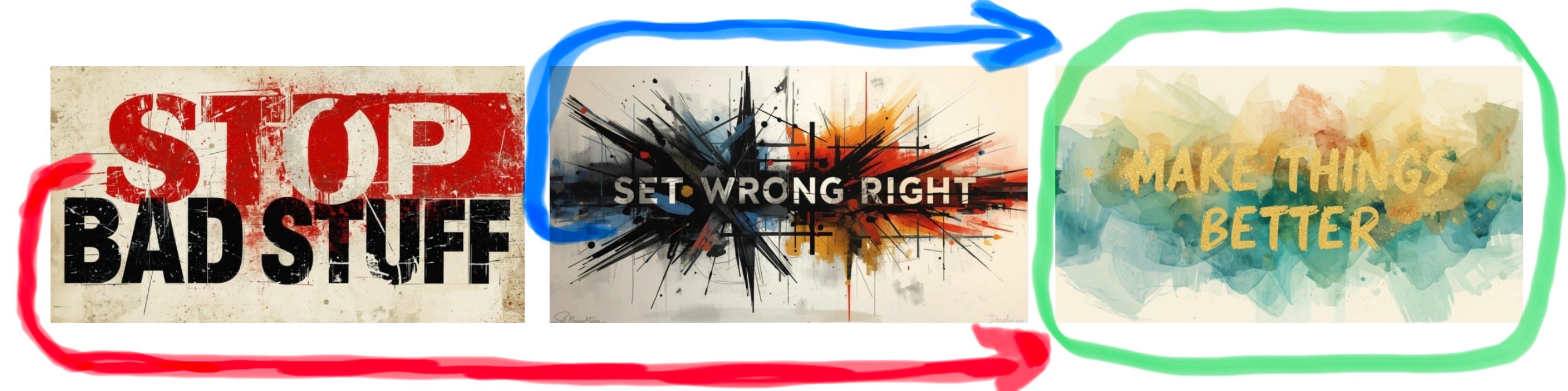 While every step in the right direction makes things better, we can’t settle for making things less bad. If we are not careful, these five distinctive aspects can lead us in that direction, can have us settle for stopping the bad stuff. There is a huge amount to do to stop the bad stuff, but we can do so in ways that also set wrong right and make things better. We must continually strive for all three together.