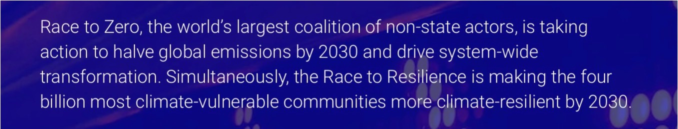 To conclude this 9-part Subseries on coalitions and how they help us to be together enough, my final examples are Race to Zero and Race to Resilience. As you can see from the quote above from their website, they claim Race to Zero to be “the world’s largest coalition of non-state actors,” while Race to Resilience is helping 4 billion vulnerable communities become resilient by 2030.