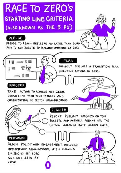 Race to Zero participants must meet detailed and rigorous criteria to help ensure their seriousness. This includes “maximum effort toward or beyond a fair share of the 50% global reduction in CO2 by 2030.” To join this race at what they call the “Starting Line,” also described as “a minimum floor for robust net zero commitments,” all members must fulfill “procedural requirements” known as “the 5 Ps”: