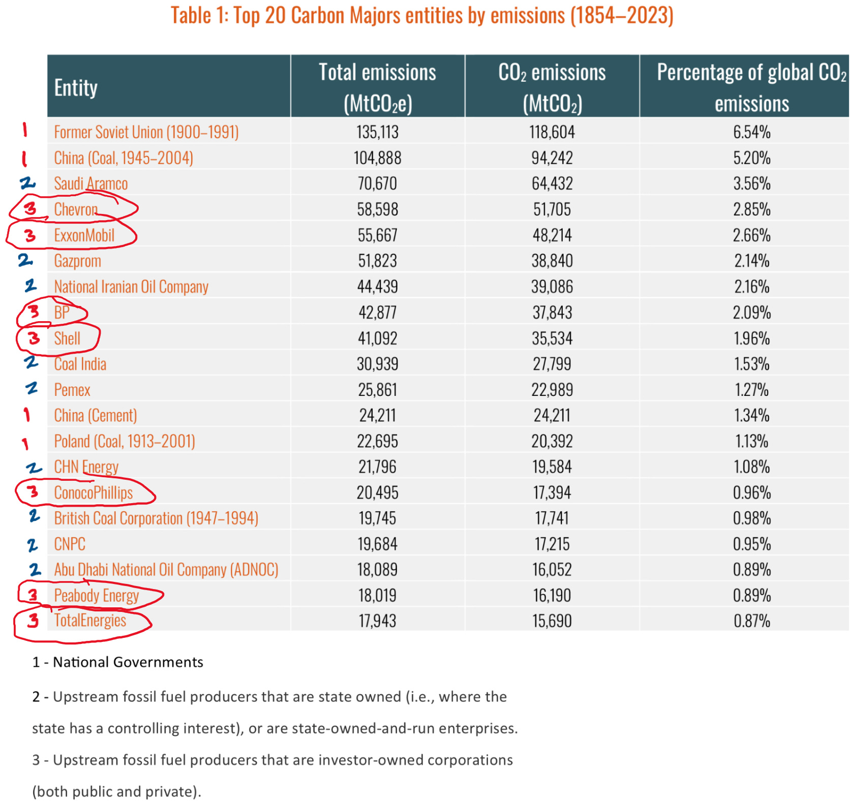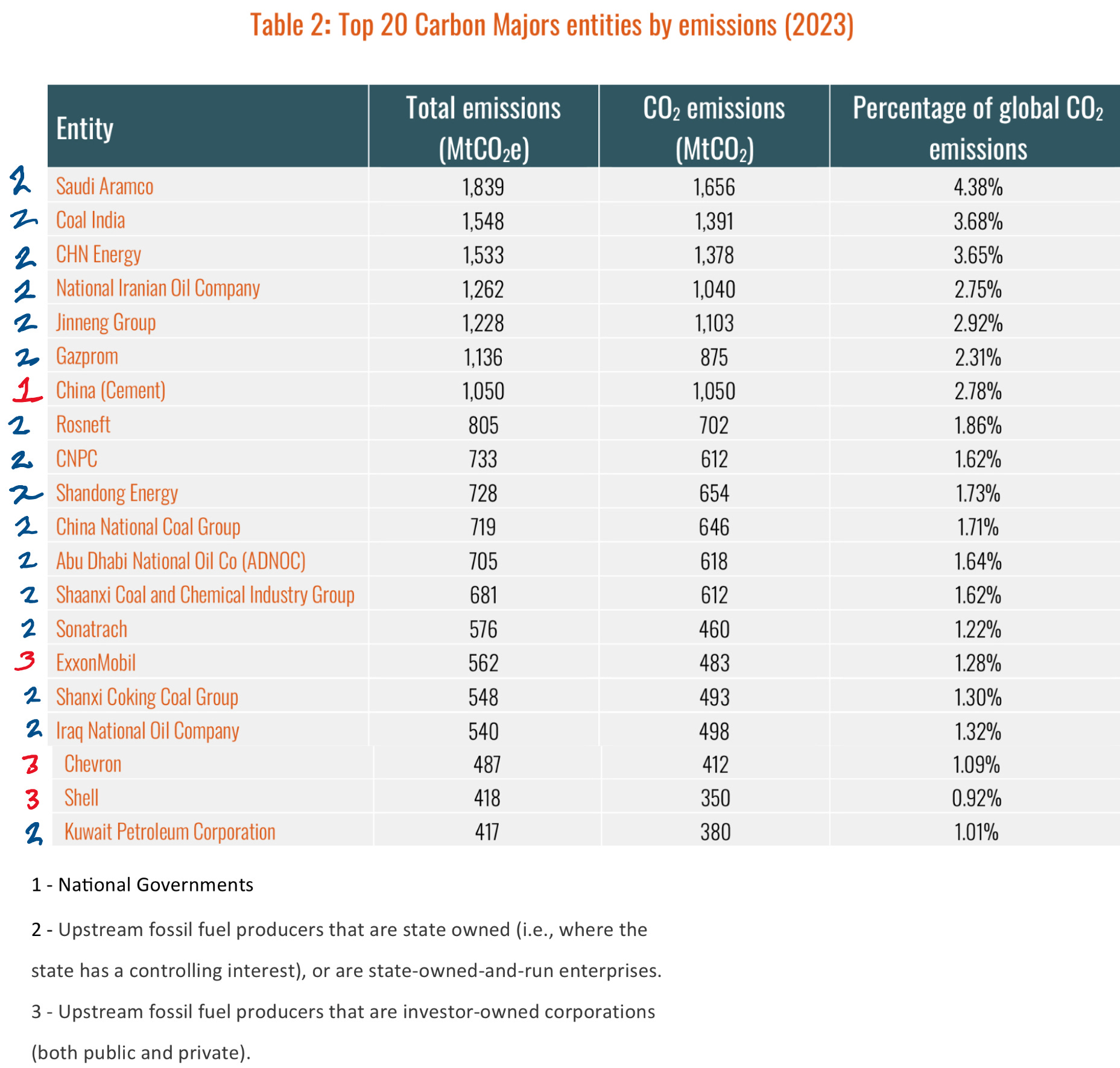 But we can’t stop the past. It’s already baked in. We can only stop pollution in the present. Table 2 below of top Carbon Majors in 2023 is a rough guide on who we must target. Nine of the top 10 and 16 of the top 20 are state owned.