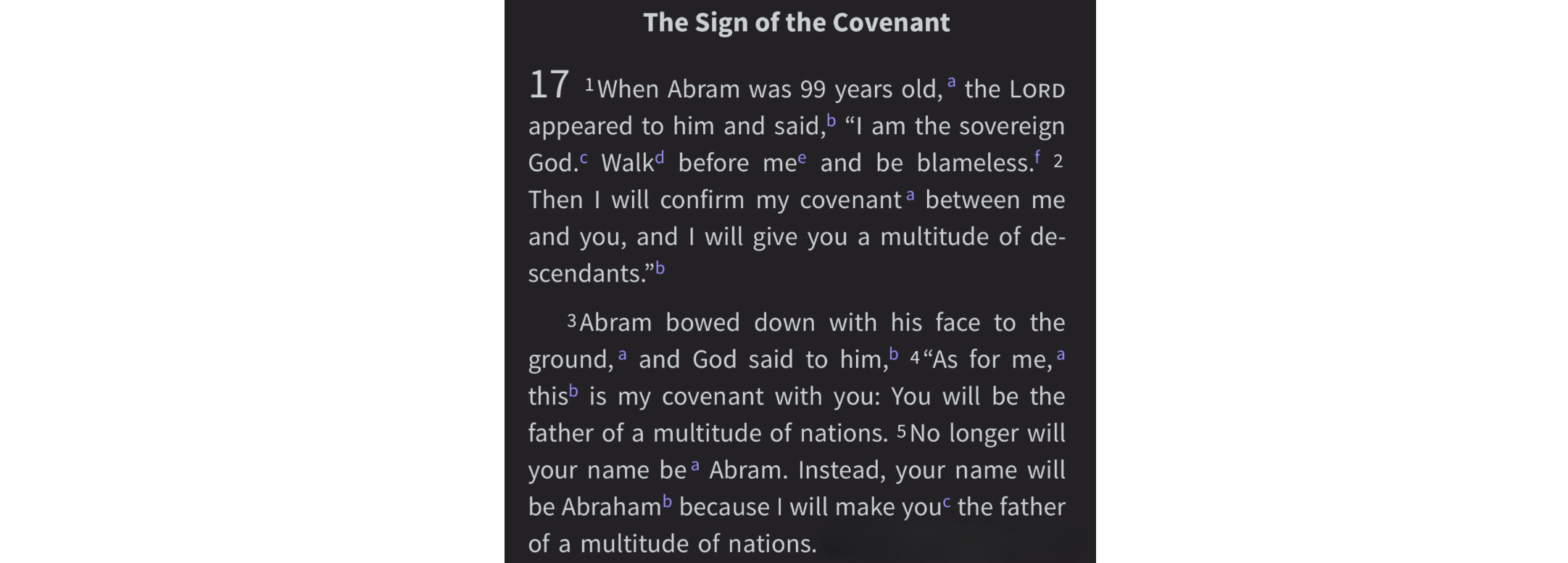 As a prominent example, God’s promise to Abram that he will be the forebearer of many nations in the future is so significant that it is recognized by the changing of his name from Abram to Abraham. Roughly 2,000 thousand years into the future the Apostle Paul will lift up this promise to Abraham in his letter to the Romans. And about 600 years after Paul the Koran will also lift up Abraham as an exemplar of the faith.