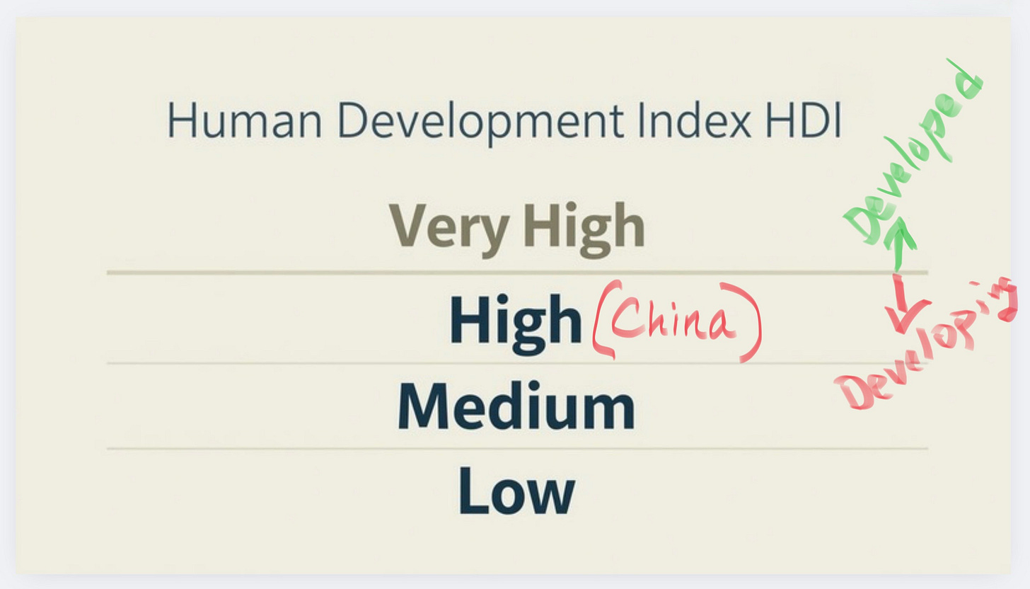 So is China a “developing” country, as the nation is still classified in international climate negotiations? The answer is yes according to the UN, which uses their Human Development Index (HDI) to classify countries as Very High, High, Medium, and Low. A perfect HDI score is 1.0. Countries at 0.8 or above are in the Very High category and are considered “developed.” Everyone else is still “developing.” China, currently ranked 75th in the world, is in the High category with a HDI score of 0.788.