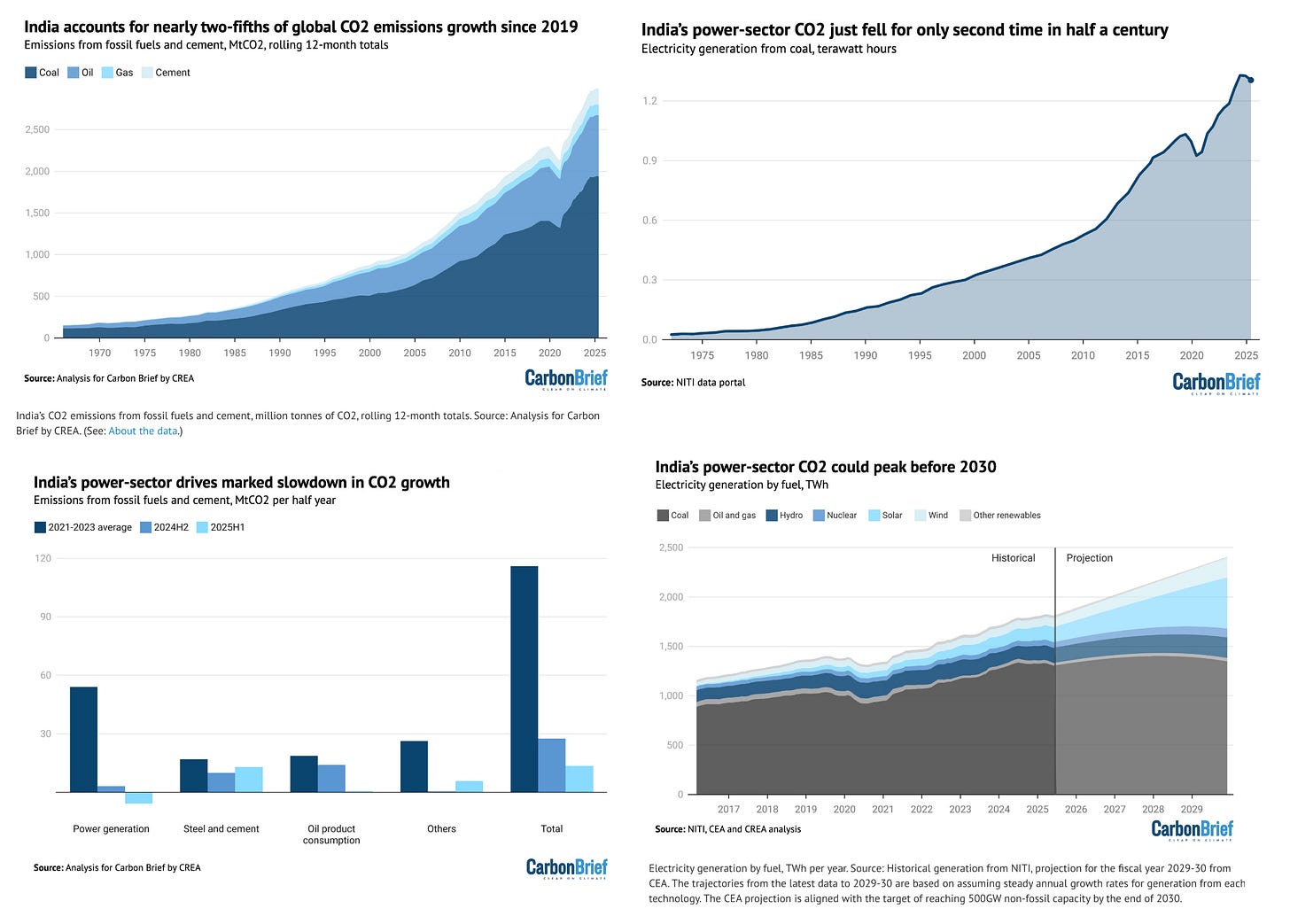 India’s clean energy production this year is up by 20%, while coal’s contribution continues to fall. As Ember reports, “In 2024, Coal generation met 64% of India’s electricity demand growth, a sharp drop from 91% in 2023.” And this year electricity from coal actually dropped. The CarbonBrief graphs below tell the story. India’s electricity sector CO2 could peak before 2030.