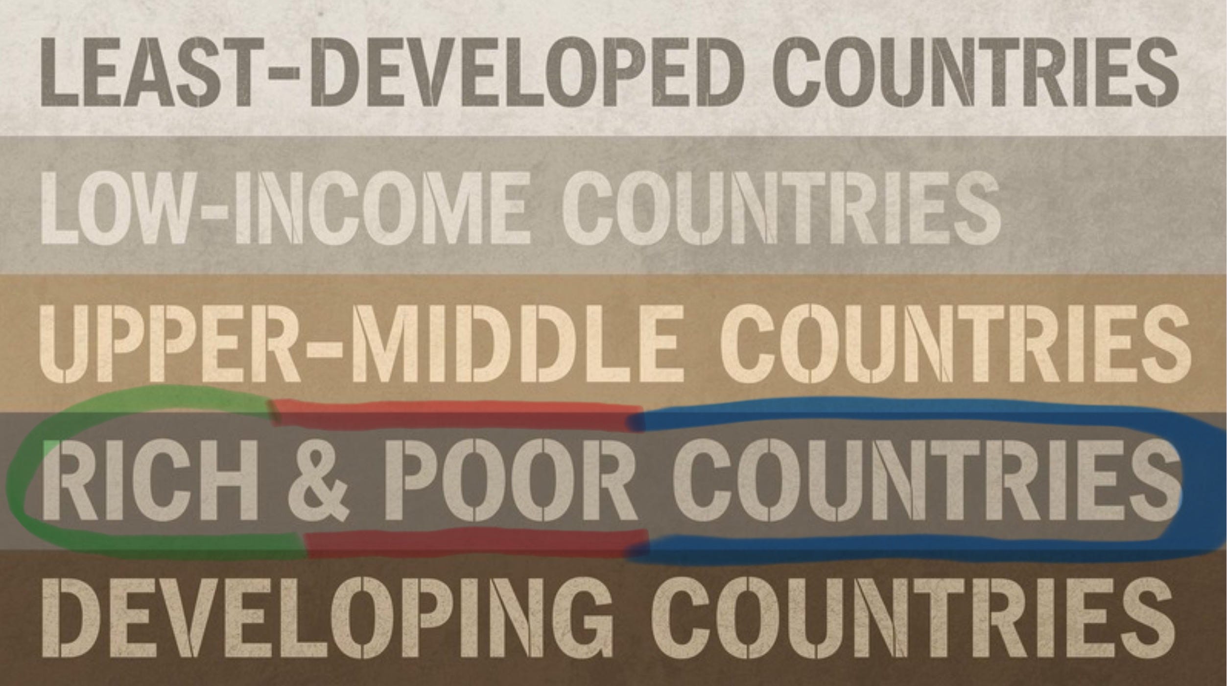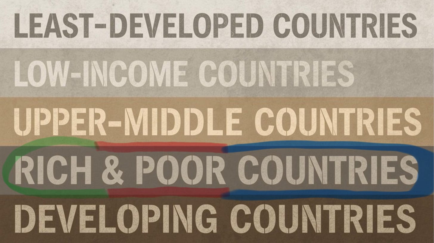 “Rich” and “poor” countries are not monolithic blocks, of course, and in the international context there are further differentiations among so-called developing countries. Labeling a country as rich or developed is much simpler than how to categorize everyone else.