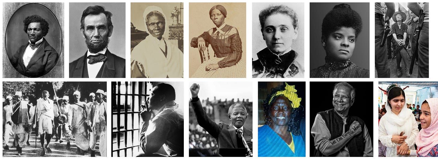 Our past also includes all those seeking justice that have come before us. Our heroes include Frederick Douglas, Abraham Lincoln, Sojourner Truth, Harriet Tubman, Jane Addams, Ida Wells, Dorothy Day, Mahatma Gandhi, the Rev. Dr. Martin Luther King, Jr., Nelson Mandela, Wangari Maathai — and those still doing so like Muhammad Yunus and Malala Yousafzai. It includes not just the well-known, but the lesser known and the unknown — whose role is just as important, because social change leaders cannot exist as such without a movement and supporters of the movement.