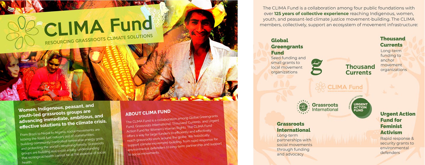 Another foundation-led coalition is The CLIMA Fund , a “collaboration” comprised of four foundations: the Global Greengrants Fund, Grassroots International, Thousand Currents, and the Urgent Action Fund for Women’s Human Rights. CLIMA Fund members have given over 20,000 grants to grassroots groups in 168 countries over nearly four decades. These grants “address the root causes and the destructive outcomes of the climate crisis.”