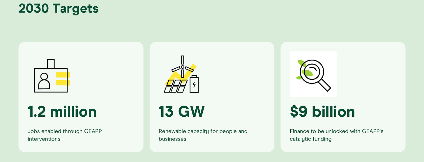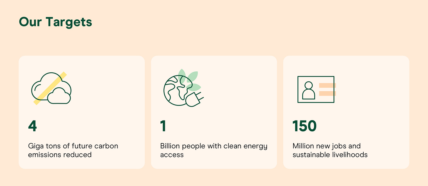 Their goals include 1 billion people with clean energy access and 150 million new jobs in the countries they are working in.