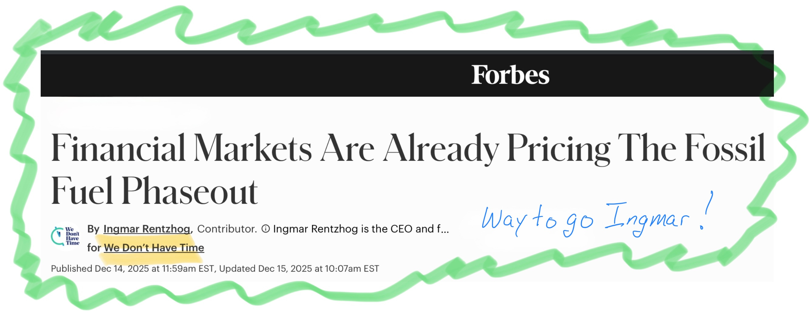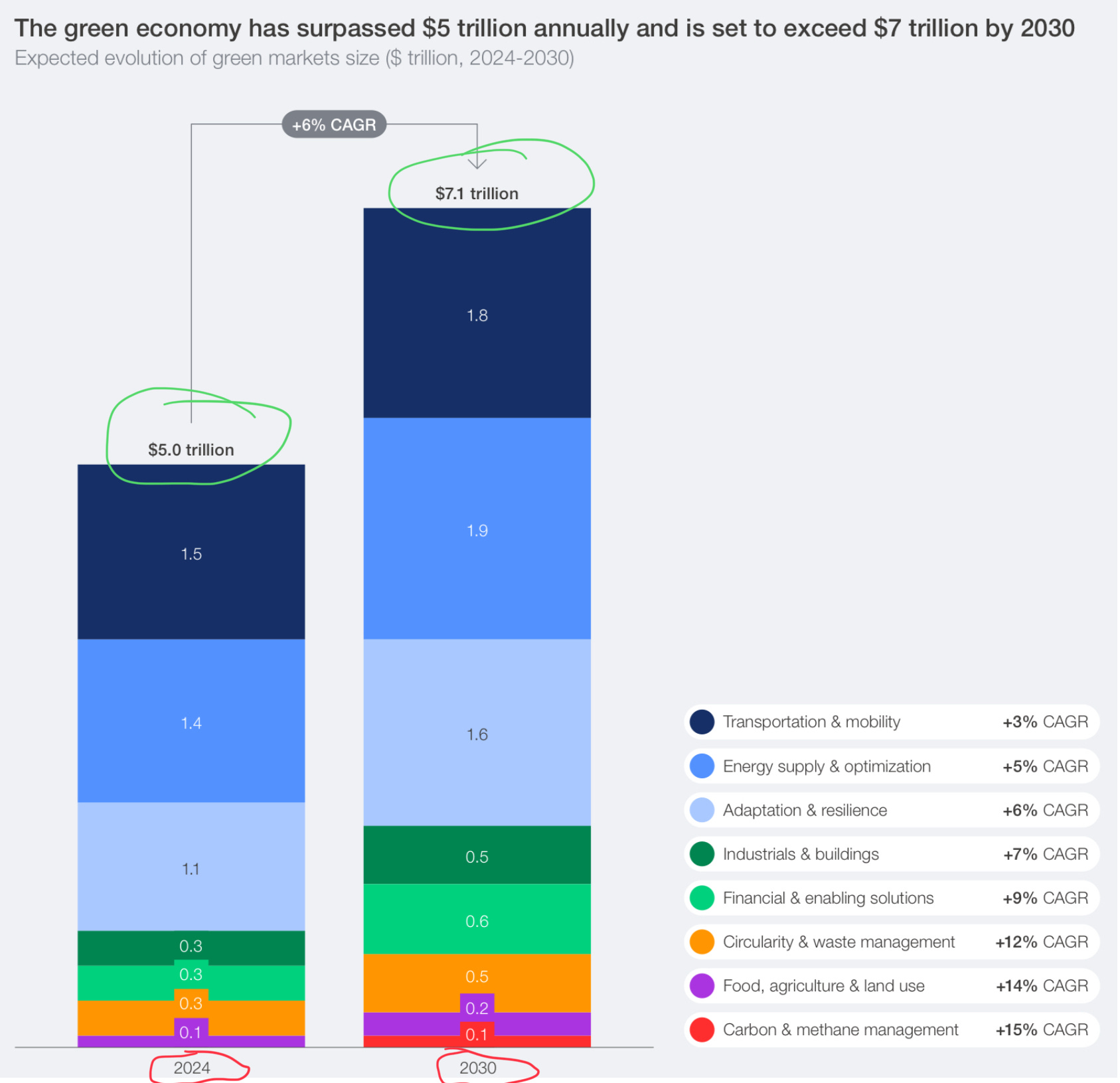 Markets are working for us: “The green/climate economy has surpassed $5 trillion annually and will exceed $7 trillion by 2030.