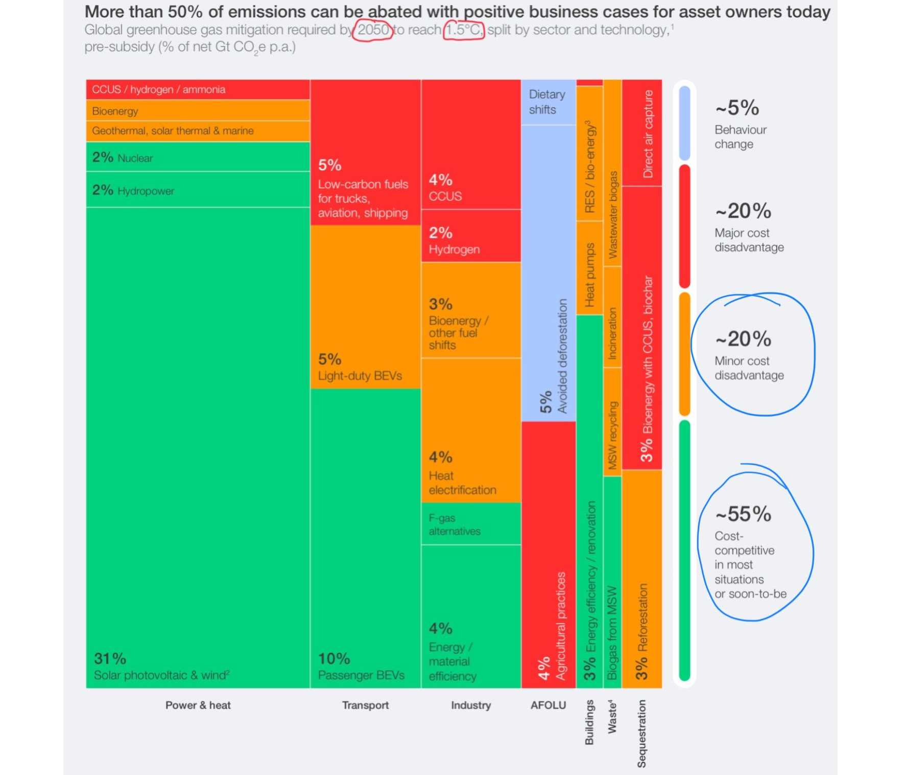 To achieve 1.5C by 2050 — our temperature reduction goal — about 75% of needed mitigation efforts are cost competitive today (55%) or nearly so (20%).”