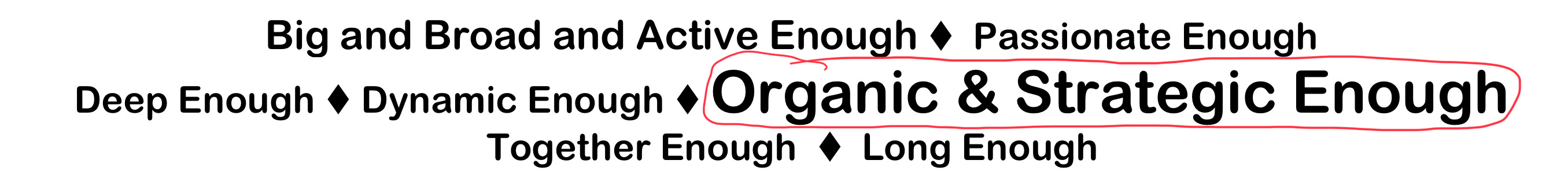 At the same time, strategic change without organic change will be stifling, limiting, and ultimately depressing for many. We will not achieve our vision, purpose, and Major Goal — the essence, the telos, of strategic change — without organic change. Why? Once again, because we’re on the climate-clock and the speed and scale of change needed has never been attempted in the history of humanity.